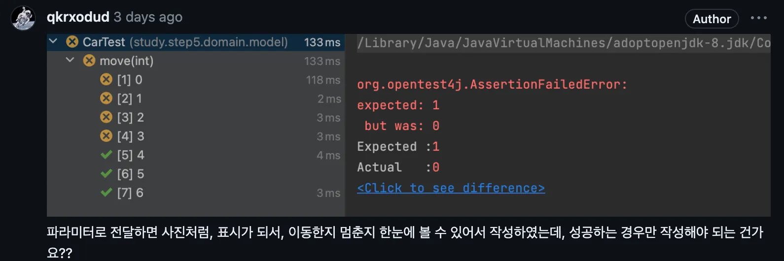 생각정리 : 파라미터로 전달하면 사진처럼, 표시가 되서, 이동한지 멈춘지 한눈에 볼 수 있어서 작성하였는데, 성공하는 경우만 작성해야 되는 건가요?? 질문을 했는데. 다른 사람이 봤을 경우 왜 실패했는지 확인 할 것 같다. 통과하는 테스트 코드만을 작성하자.!