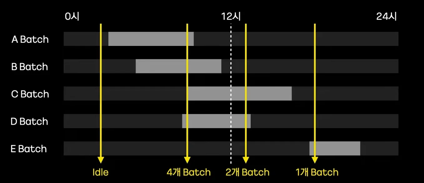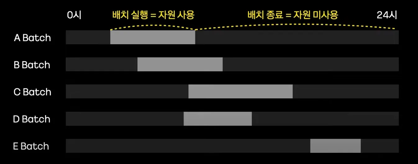 배치는 특정시간에만 자원을 할당하여 동작하고, 이후에는 자원을 사용하지 않는다. (os에 반납)