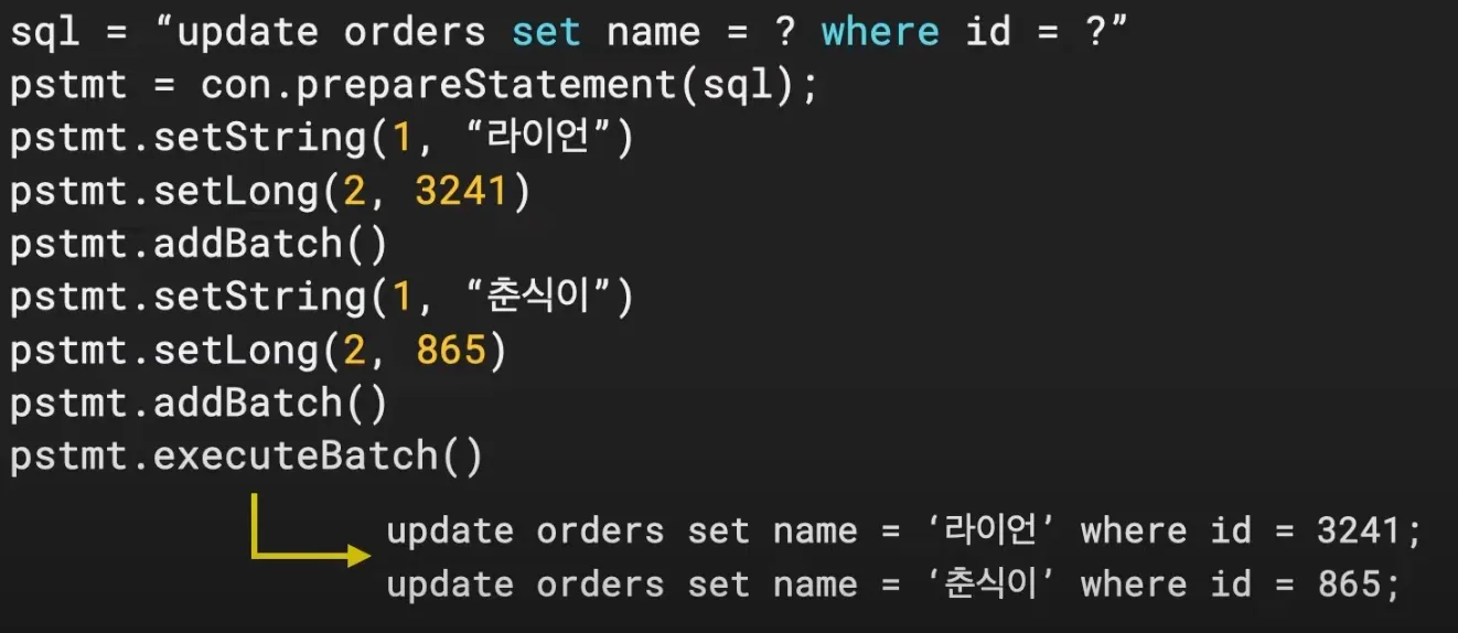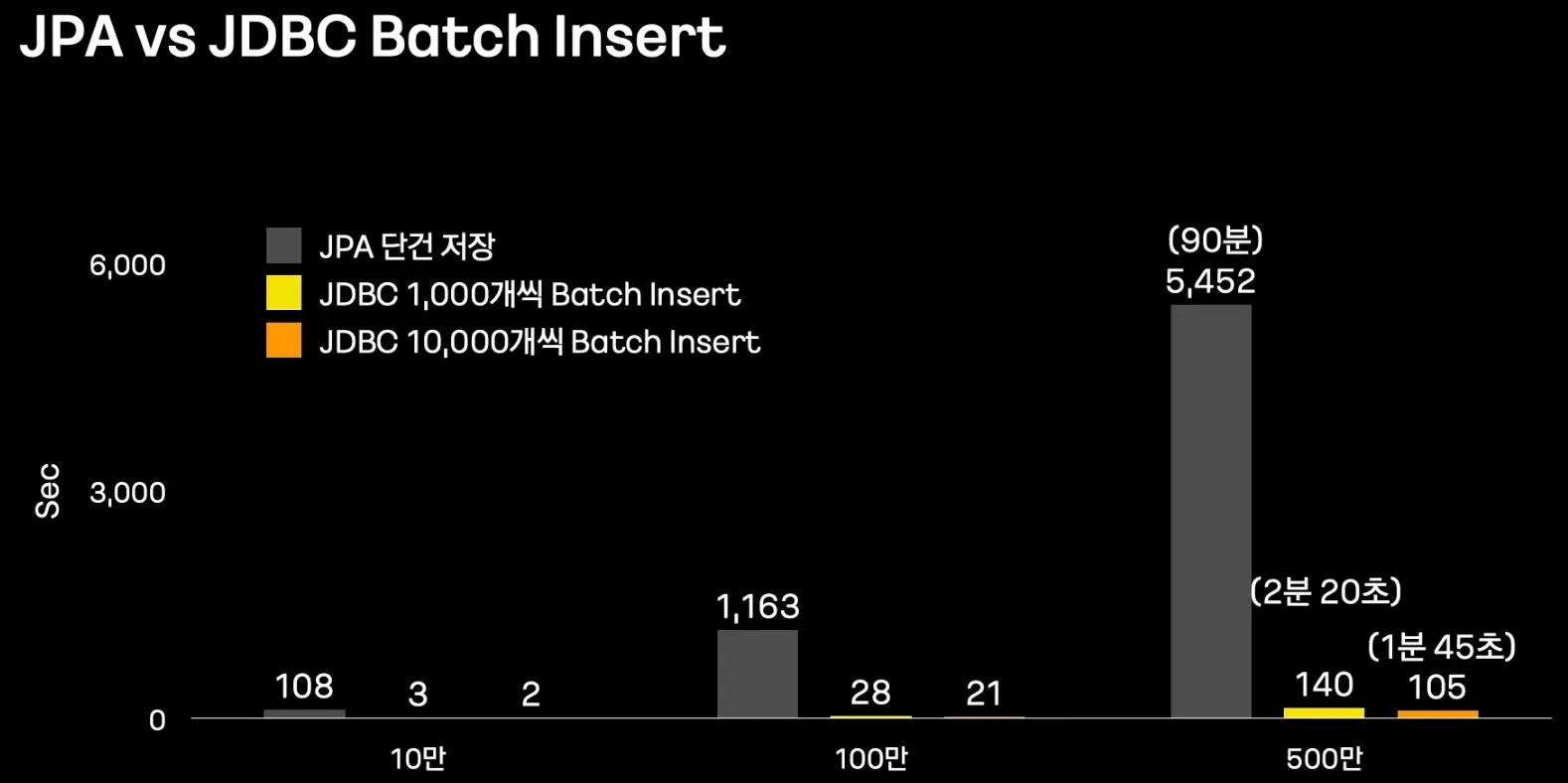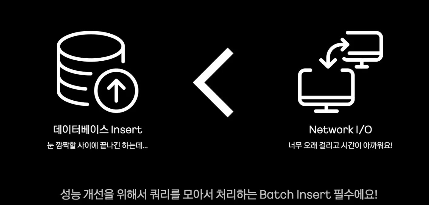 데이터베이스 Insert는 눈 깜짝 할사이에 끝나긴 하는데, 네트워크에 드는 레이턴시가 오래걸림. → 성능 개선을 위해서 쿼리를 모아서 처리하는 Batch Insert는 필수다.