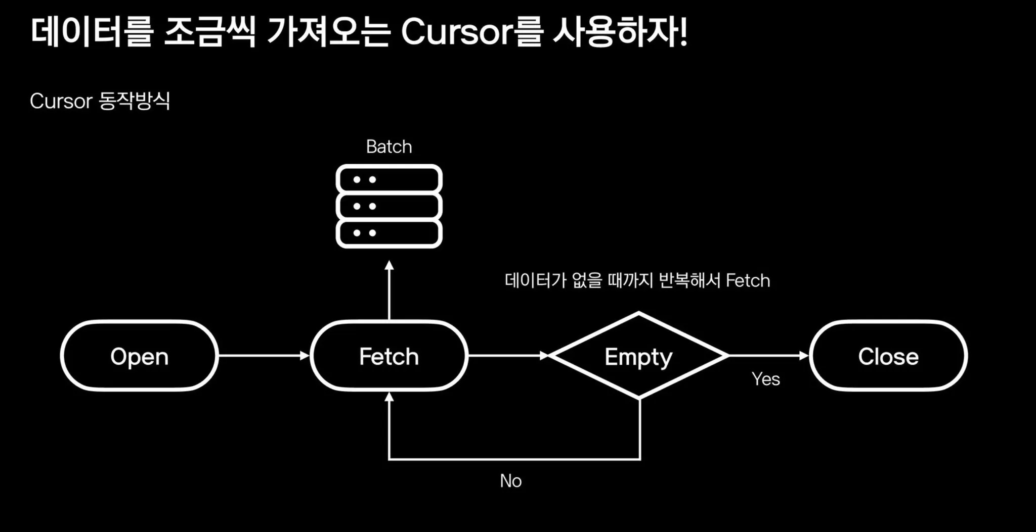 MYSQL Cursor방식 데이터를 모두 읽고 서버에서 아이디레이터로 커서하는 방식이기 때문에 데이터 개수가 많으면 oom을 유발하는 치명적인 문제가있음. 사용하지 않기를 바람
