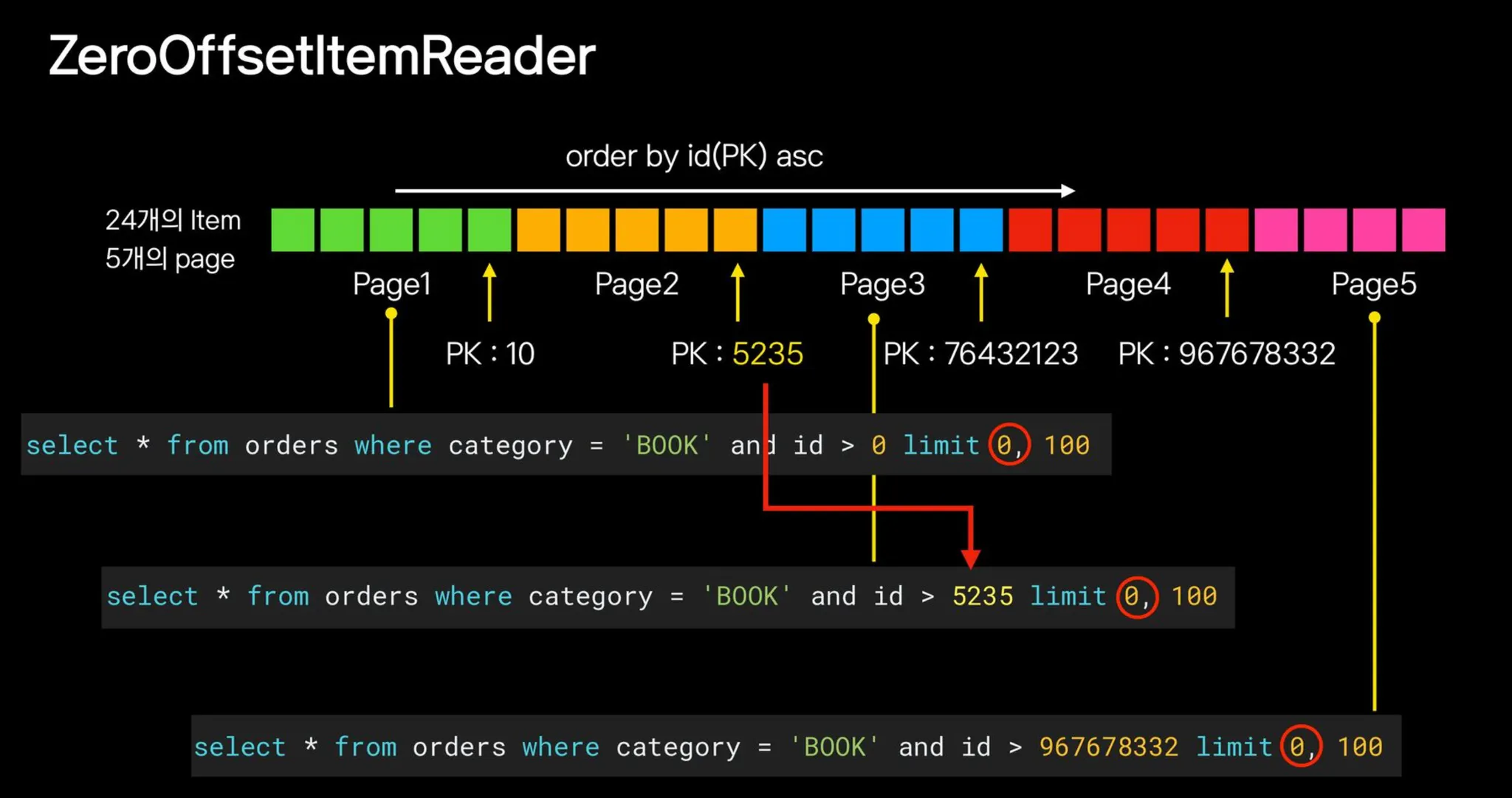 select * from orders where category = 'BOOK' and id > 0 limit 0, 100; -- zeroOffset