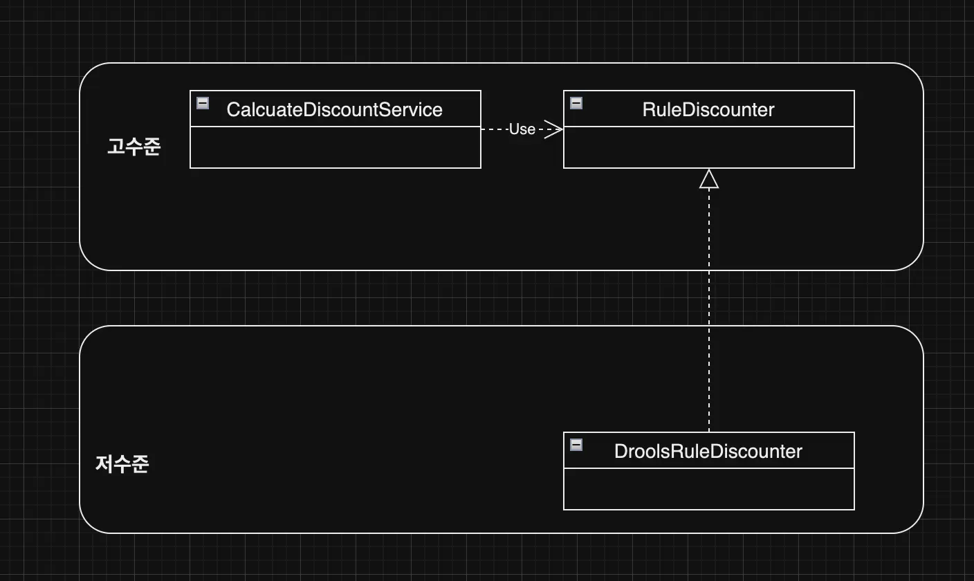CalcuateDiscountService는 고수준 모듈 이다. 고수준 모듈은 의미 있는 단일 기능을 제공하는 모듈로 가격 할인 계산 이라는 기능을 구현한다. 고수준의 기능을 구현하려면 여러 하위 기능이 필요하다.