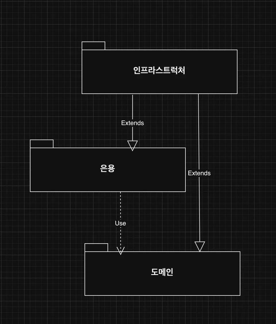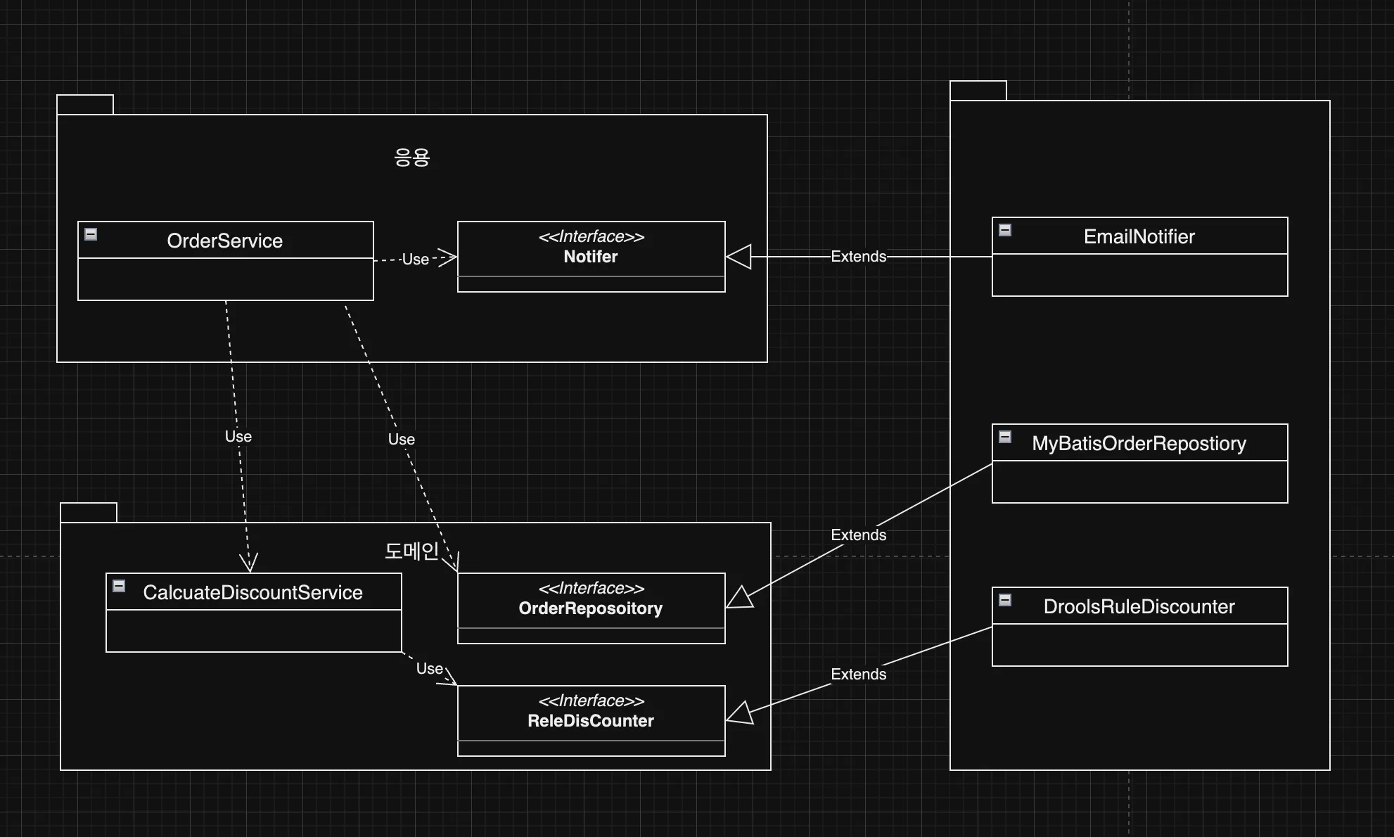 아키텍처 수준에서 DIP를 적용하면 인프라스트럭처 영역이 응용 영역과 도메인 영역에 의존하는 구조가된다.