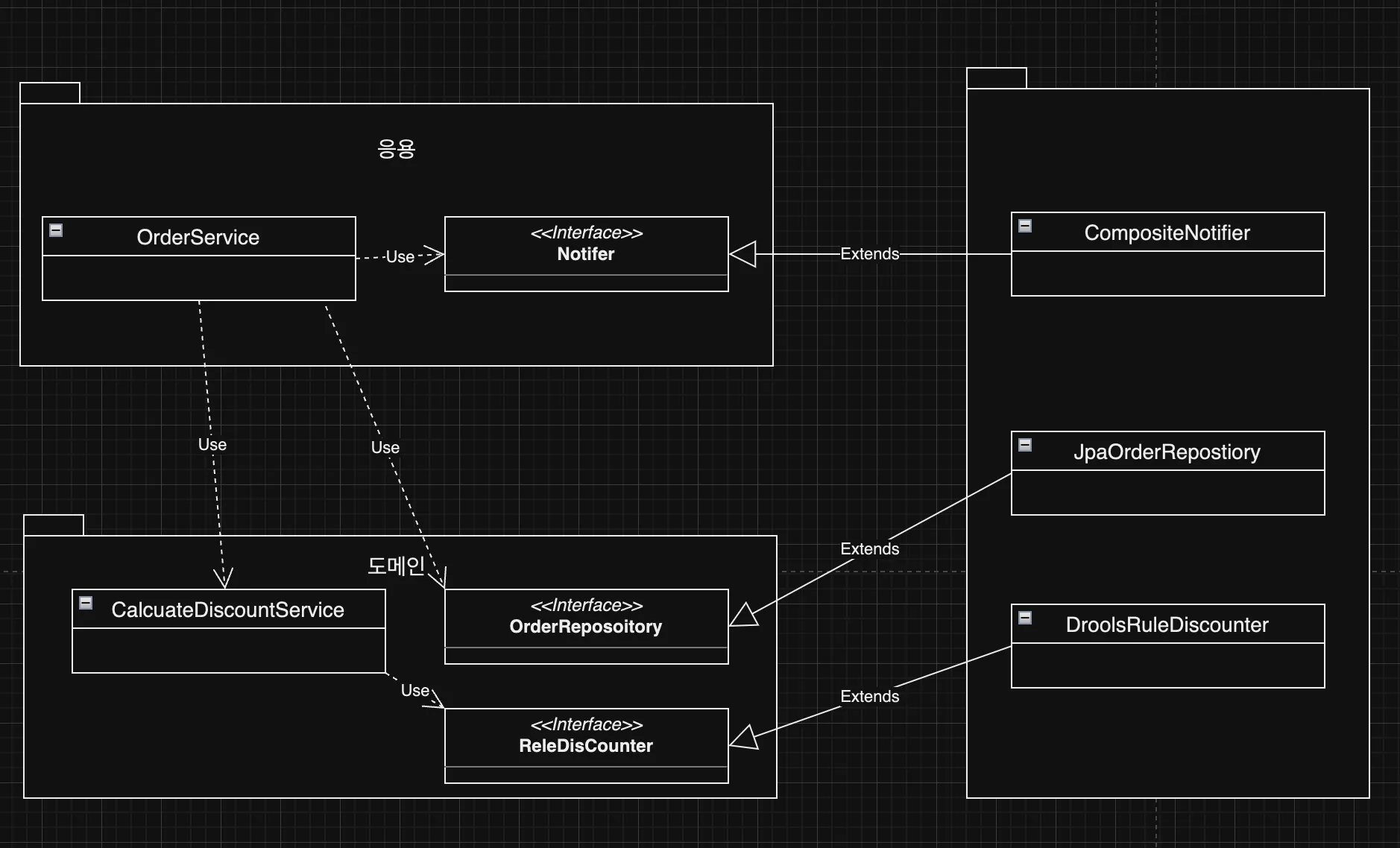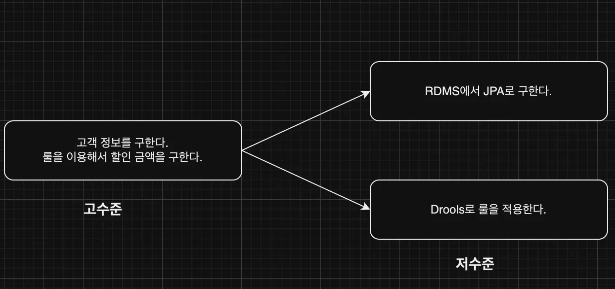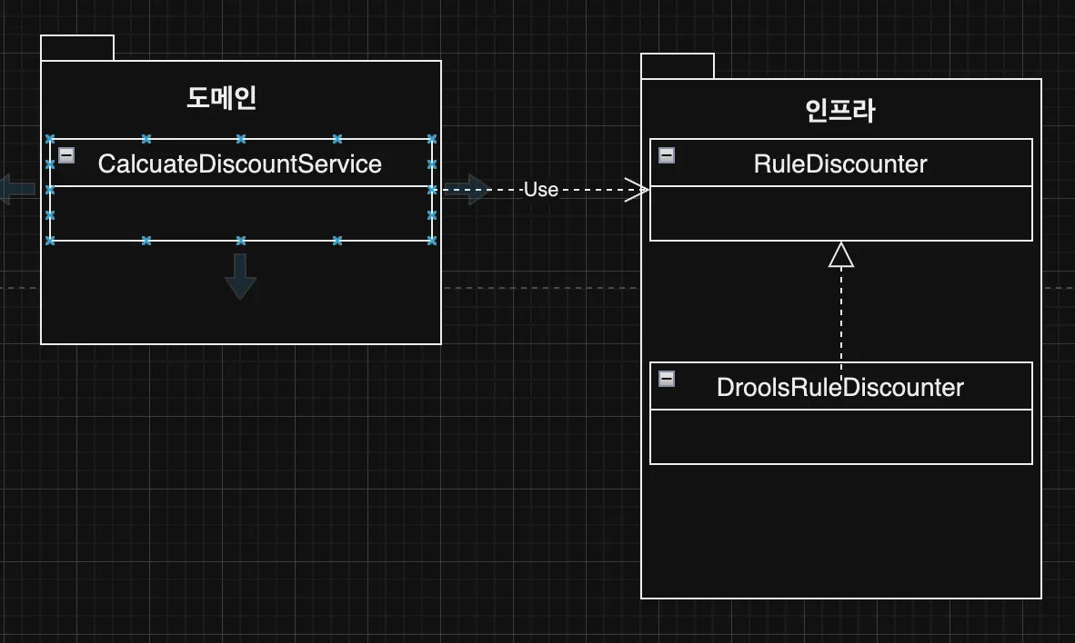 CalcuateDiscountService 입장에서는 적용룰을 Drools로 구현했는지 자바로 직접 구현했는지 중요하지 않다.
