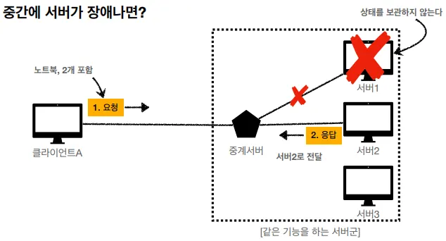 상태 유지: 상태를 서버에서 저장, 중간에 서버가 바뀌면 안된다.