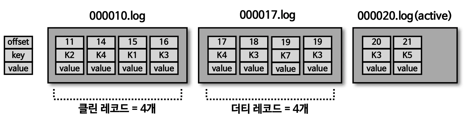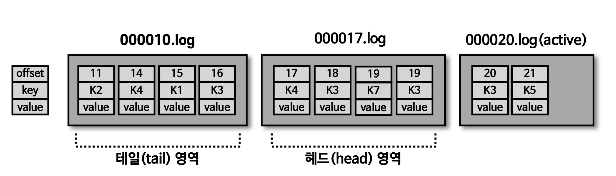 테일 영역 : 압축 정책에 의해 압출이 완료된 레코드들, 클린(clean)로그 라고 부른다. 중복 메시지 키가 없다.
