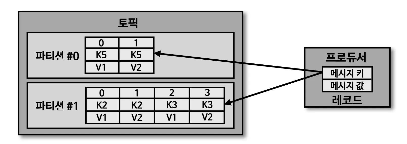 파티션 : 프로듀서가 보내 데이터들이 들어가 저장되는 곳 이 데이터를 레코드라 부른다.