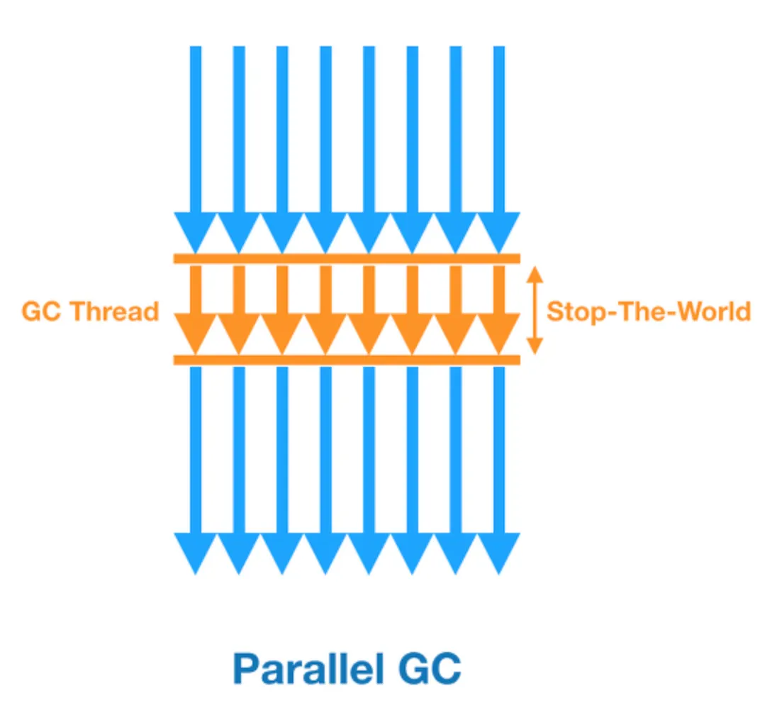 Stop-The-World: GC 작업을 병렬로 처리하므로, Stop-The-World 시간이 Serial GC보다 짧습니다. 하지만 여전히 애플리케이션의 모든 스레드가 멈춥니다.