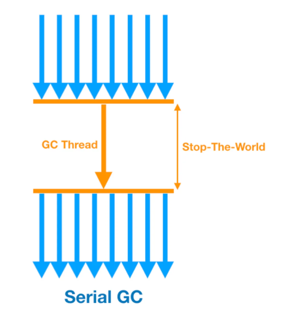 Stop-The-World: Serial GC는 GC를 처리하는 동안 애플리케이션 스레드를 멈춥니다. 모든 GC 작업이 단일 스레드에서 진행되기 때문에 Stop-The-World 시간이 길어질 수 있습니다.