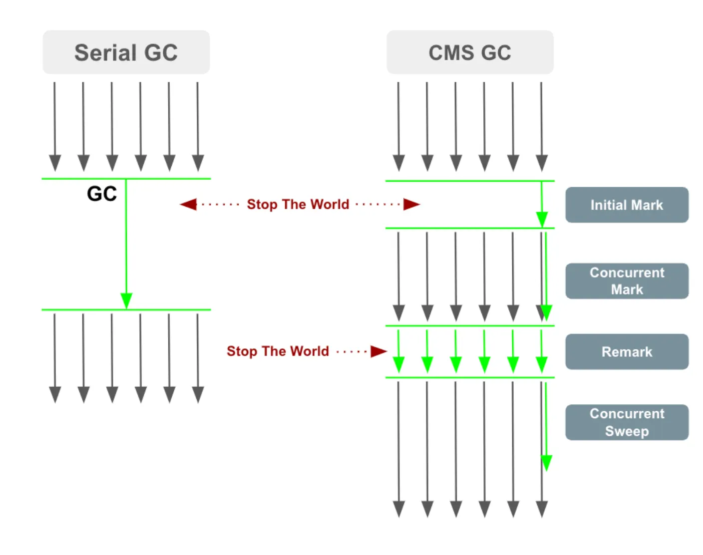 Stop-The-World: CMS는 Stop-The-World 시간을 최소화하려고 설계되었지만, Initial Mark와 Remark 단계에서는 애플리케이션이 멈춥니다. 그 외에는 애플리케이션과 동시에 작업이 진행됩니다.