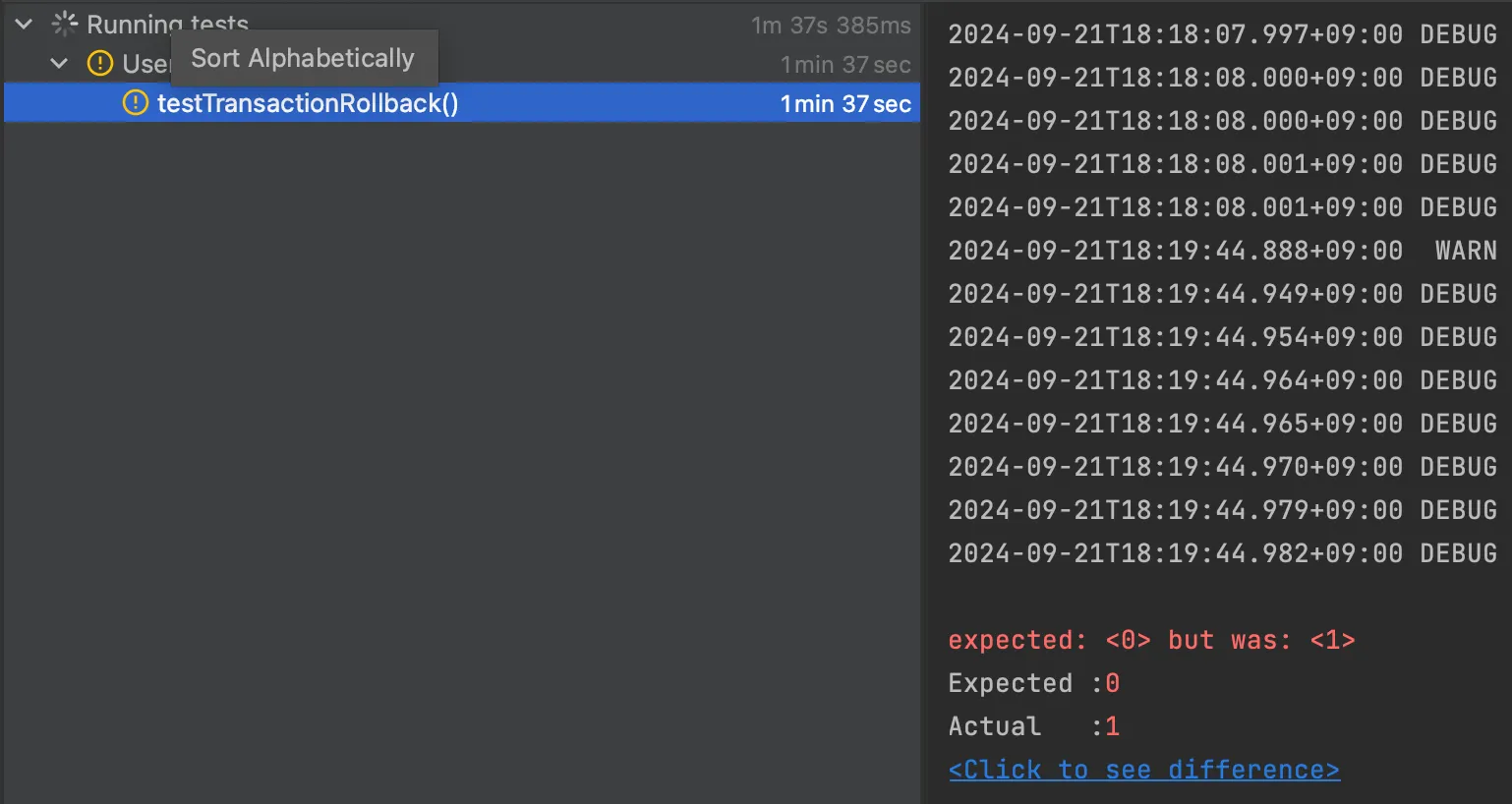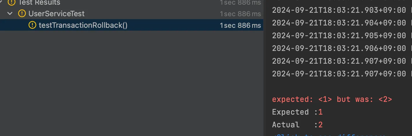 때문에 Transaction 함수 내부에서 Try-catch를 하게 되면 예외를 잡게 돼서 롤백이 안 되는 것을 확인할 수 있습니다.