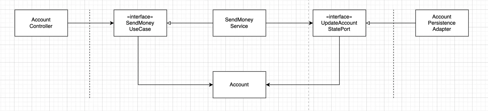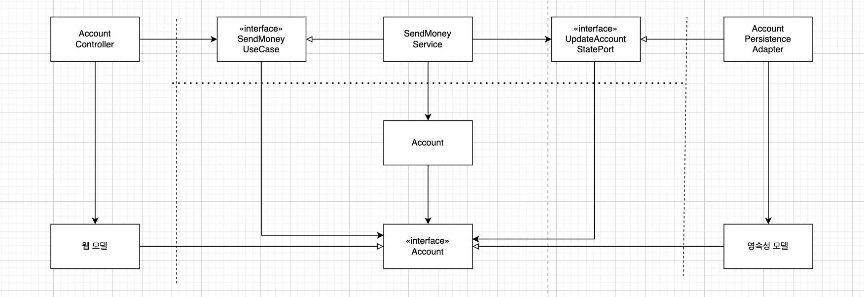 웹 계층에서는 웹 컨트롤러가 ’SendMoneyUseCase’ 인터페이스를 호출해서 유스케이스를 실행한다. 이 인터페이스는 Account 객체를 인자로 가진다. 즉, 웹 계층과 애플리케이션 계층 모두 Account 클래스에 접근해야 한다는 것을 의미한다.