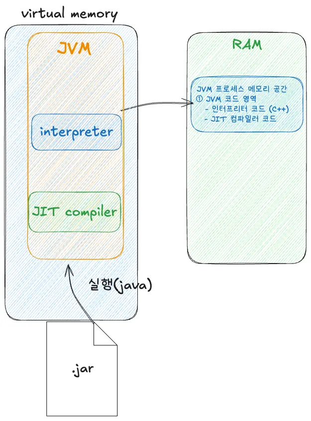 java 명령으로 프로그램을 실행하면 기본적으로 인터프리터가 바이트코드를 해석하며 실행