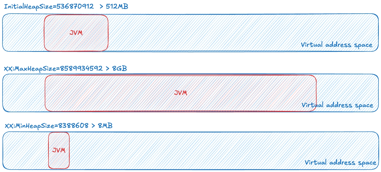 inital heap size : JVM이 시작할 때 바로 확보되는 Heap 크기 : RAM의 1/64