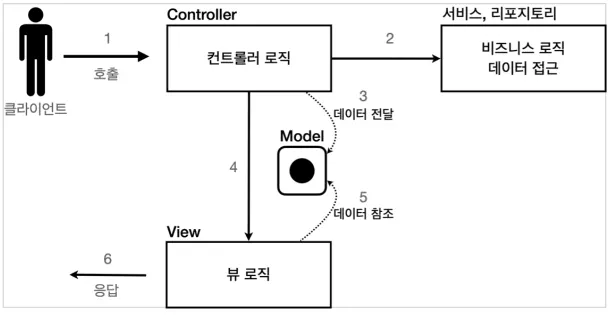 컨트롤러: HTTP 요청을 받아서 파라미터를 검증하고, 비지니스 로직을 실행한다. 그리고 뷰에 전달할 결과 데이터를 조회해서 모델에 담는다.