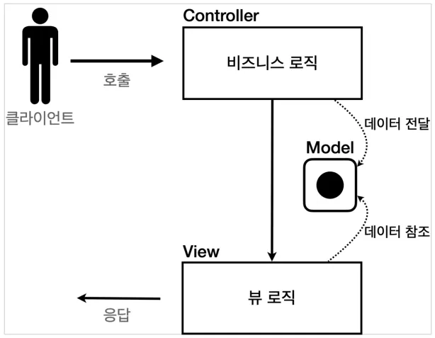 모델: 뷰에 출력할 데이터를 담아둔다. 뷰가 필요한 데이터를 모두 모델에 담아서 전달해주는 덕분에 뷰는 비지니스 로직이나 데이터 접근을 몰라도 되고, 화면을 렌더링 하는 일에 집중할 수 있다.