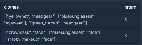 스파이가 가진 의상들이 담긴 2차원 배열 clothes가 주어질 때 서로 다른 옷의 조합의 수를 return 하도록 solution 함수를 작성해주세요.