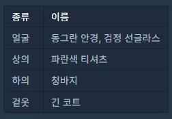 clothes의 각 행은 [의상의 이름, 의상의 종류]로 이루어져 있습니다.