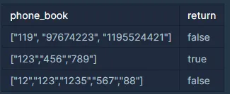 입출력 예 #3첫 번째 전화번호, “12”가 두 번째 전화번호 “123”의 접두사입니다. 따라서 답은 false입니다.