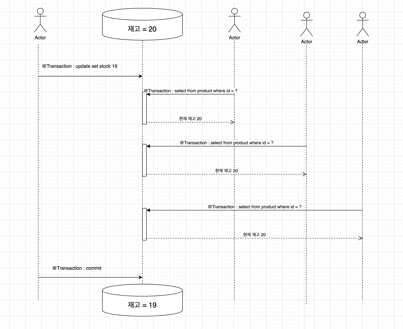 즉 데이터가 커밋 되기 전에 조회되고, 재고의 카운트가 20으로 인지하여 동시성 이슈가 발생합니다.