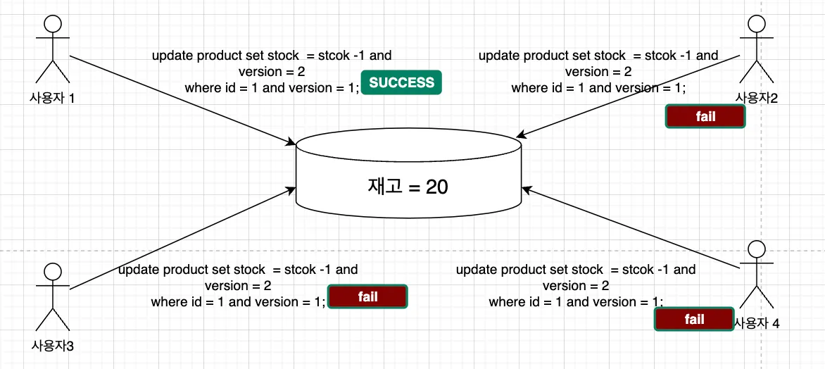 사용자 4 : update 실패 version =1을 사용자 1에서 업데이트했기 때문에 찾을 수 없어서Exception 발생