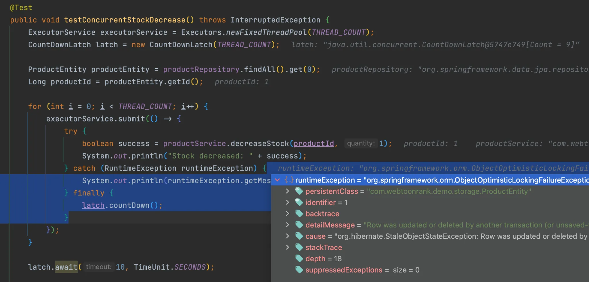 org.springframework.orm.ObjectOptimisticLockingFailureException: Row was updated or deleted by another transaction (or unsaved-value mapping was incorrect) : [com.webtoonrank.demo.storage.ProductEntity#1] 를 통해서 트랜잭션이 실패되고, 롤백되는 것을 확인할 수 있습니다.