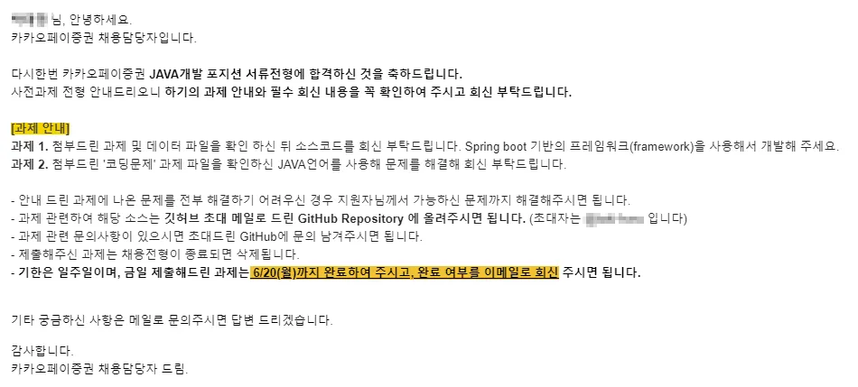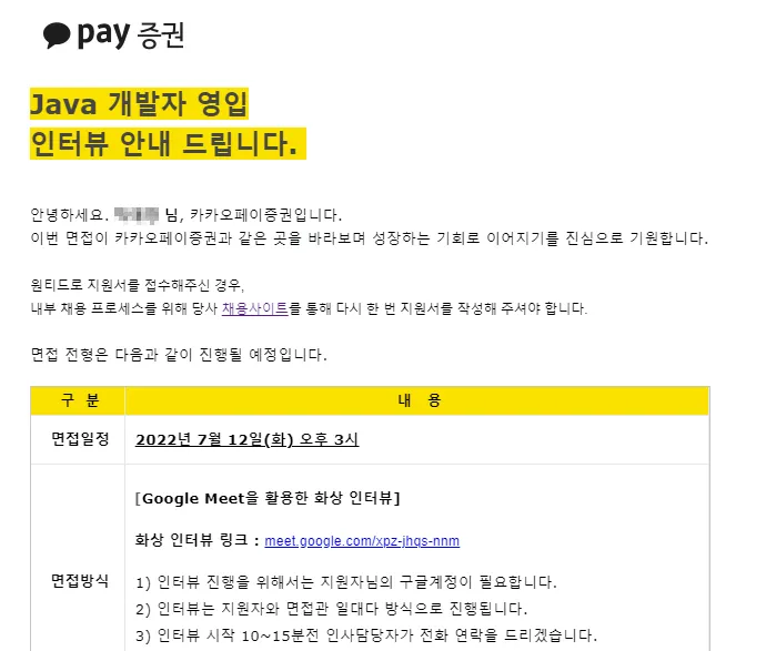 카카오페이 증권은 2022년 6월쯤에 원티드에서 JAVA 개발 부문이라는 카테고리로 지원하게 되었다. 블로그에 정리한 내용 및 자소서를 토대로 지원하게 되었으며, 서류를 통과하게 되었다. 항상 느끼는 거지만 합격이라는 단어는 기분을 참 좋게 한다.