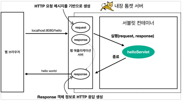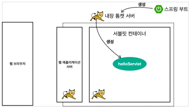 서블릿은 톰캣 같은 웹 애플리케이션 서버를 직접 설치하고, 그 위에 서블릿 코드를 클래스 파일로 비들해서 올린다음, 톰캣 서버를 실행하면 된다. 하지만 이과정은 매우 번거롭다. 스프링 부트는 톰캣 서버를 내장하고 있으므로, 톰캣 서버 설치 없이 편리하게 서블릿 코드를 실행할 수 있다.