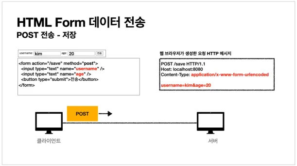 HTML form 데이터도 메시지 바디를 통해 전송되므로 직접 읽을 수 있다. 하지만 편리한 파라미터 조회 기능(request.getParameter(…))을 이미 제공하기 때문에 파라미터 조회 기능ㅇ르 사용하면 된다.