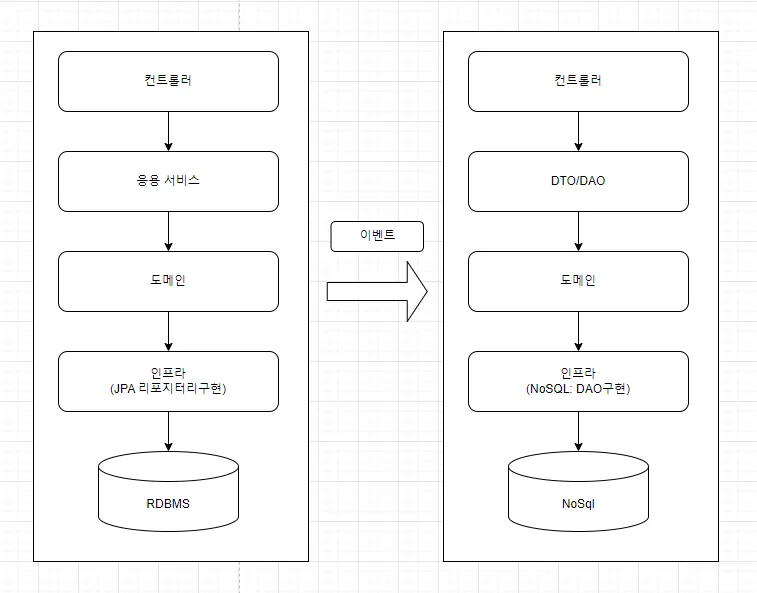 명령 모델에서 데이터가 변경되면 조회 모델에 반영(동기 이벤트와 글로벌 트랜잭션을 사용) → 동기 이벤트와 글로벌 트랜잭션으로 전반적인 성능이 떨어진다.