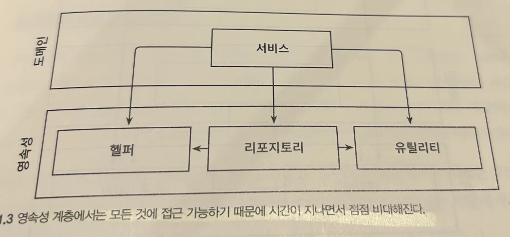 계층형 아키텍처는 많은 것들이 잘못된 방향으로 흘러가도록 용인한다. 아주 엄격한 자기 훈련 없이는 시간이 지날수록 품질이 저하되고 유지보수하기가 어려워지기 쉽다.