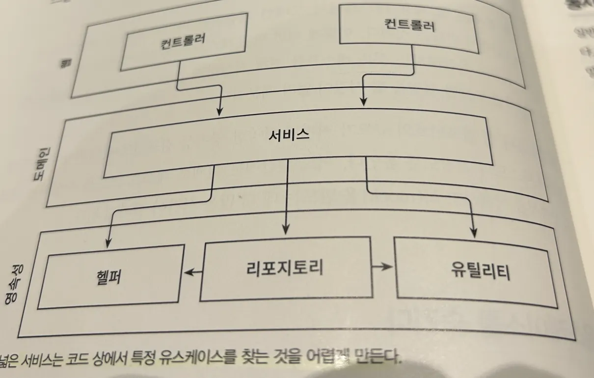 넓은 서비스는 영속성 계층에 많은 의존성을 갖게 되고, 다시 웹 레어의 많은 컴퓨넌트가 이 서비스에 의존하게 된다. 그럼 서비스를 테스트하기도 어려워지고 작업해야 할 유스케이스를 책임지는 서비스를 찾기도 어려워진다.